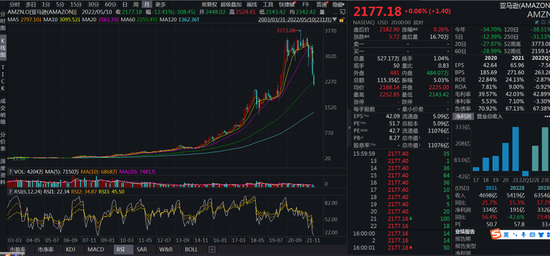 根据wind k线图,亚马逊在2003年初的时候股价只有21美元左右,目前股价也有2177美元,最高3700多美元,这至少100倍的涨幅。