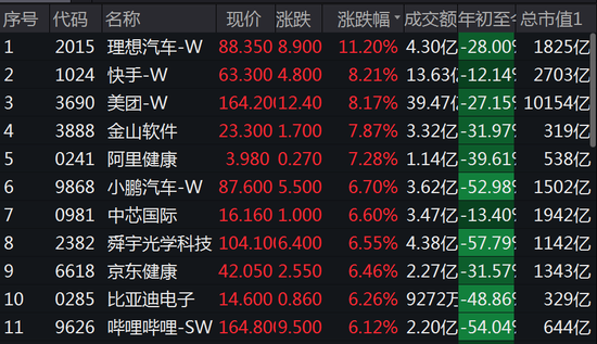 恒生科技指数临近午盘涨近5%,理想汽车涨11%,快手、美团涨8%,小鹏汽车、中芯国际、京东健康、哔哩哔哩等涨超6%,腾讯涨4.4%。