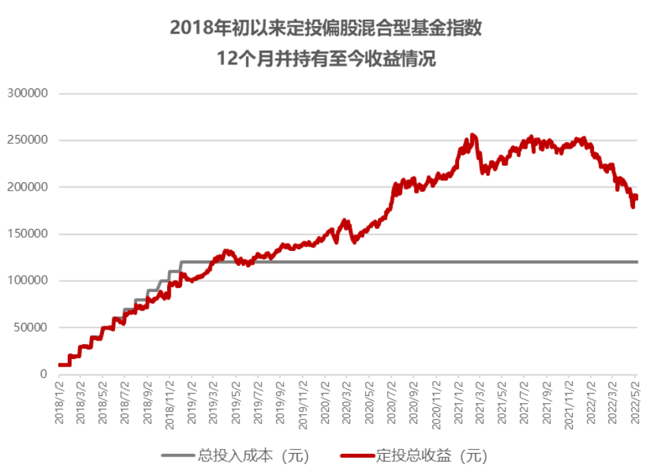 (数据来源:Wind,2022.5.9,定投期间:2018.1.2-2018.12.31,定投方式:每月第一个交易日定投10000元,总定投12期,总投入成本共计12万元。偏股混合型基金指数2018年收益率-23.58%,月定投收益率-15.70%。)