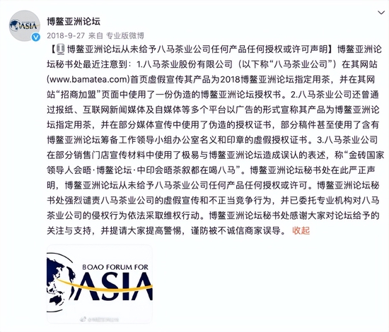 2018年9月27日,博鳌亚洲论坛官微发布微博:“从未给予八马茶业公司任何产品任何授权或许可声明。”
