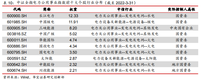 指数前十大个股来看,其中信三级行业覆盖水电、核电、火电等多个子领域,覆盖全面。实际控制人多数为国资委,部分为地方国资委和央企。