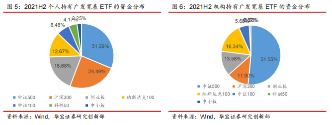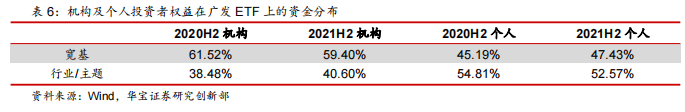 在权益ETF的具体配置上,机构投资者和个人投资者存在明显的购买差异:机构投资者偏好宽基ETF,个人投资者偏好行业主题ETF。这与行业整体趋势是一致的。截至2021年底,机构投资者持有的权益ETF中有59.40%为宽基产品。个人投资者配置标的中行业主题基金的占比较高,2021年底约为52.57%。广发行业主题ETF布局广泛,在结构性行情下优势明显,满足个人投资者追求高波动、高收益的特点。