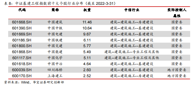 从指数前十大个股来看,其中信三级行业覆盖房建、基建、专业工程等多个领域,多数为央企,部分为地方国企。