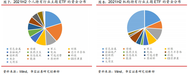 以宽基和行业主题ETF的具体跟踪标的作为对象展开进一步分析。在广发宽基ETF的配置上,超一半的机构资金偏好中证500,其余资金分散于纳斯达克100、创业板和沪深300指数,较少涉猎科创板及中小板指数。个人投资者的资金则相对分散,同样青睐中证500、沪深300等主流宽基,但对跟踪科创50和创业板指数的ETF持有比例更高。在行业主题ETF上,受前期个股换购影响,央企主题为机构资金主要持有标的。此外,机构在有色金属、军工、环保等多个行业主题上均有一定配置。个人投资者主要聚焦在有色金属、传媒、军工等热门赛道。横向比较来看,机构和个人对广发行业主题ETF的偏好较为一致,均对有色金属、军工表现出明显青睐。