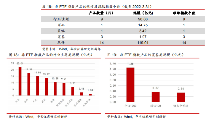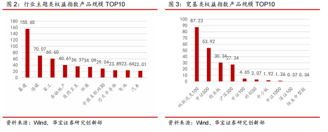 从具体的标的指数看,行业主题主要围绕传媒、军工、有色金属、基建、环保、金融地产、医药卫生、芯片半导体等领域展开布局。其中,规模最大的为基建主题的ETF及联接,合计规模为155.65亿元;传媒主题紧随其后,合计规模为70.07亿元。从宽基指数看,纳斯达克100的规模最大,ETF与联接基金规模合计为87.23亿元,其次为中证500,规模合计为53.92亿元。