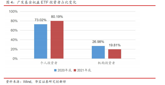 个人投资者是持有广发权益ETF产品的绝对主力。横向来看,截至2021年底,广发权益ETF中个人投资者占比80.19%,大幅领先机构投资者的占比19.81%。纵向来看,2021年底个人投资者持有广发权益ETF的比例相较于2020年底有所上升,而机构投资者持有的比例相应下降了7.17%。这是ETF逐渐普及,越来越多的个人投资者关注到该类产品的配置价值,选择将其作为投资工具的结果。