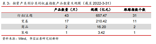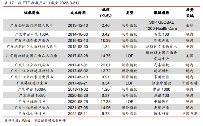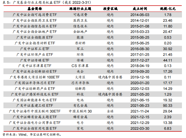广发基金在权益ETF产品上的布局广泛,围绕A股和跨境市场、抗通胀商品以及各行业主题中的细分赛道进行跟踪投资。截至2022-3-31,广发基金共有28只权益ETF,规模合计446.65亿元。