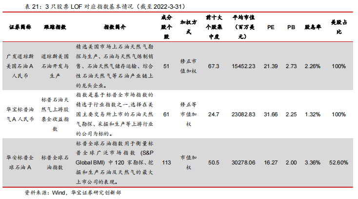 我们以3只股票LOF作为分析对象,对比其特点。从跟踪指数上看,三只产品分布对应了三只不同的油气指数。广发道琼斯美国石油A人民币对应的是道琼斯美国石油开发与生产指数;华宝标普油气A人民币对应的是标普石油天然气上游股票全收益指数;华南标普全球石油A跟踪的是标普全球石油指数。从个股数量上看,道琼斯美国石油开发与生产指数和标普石油天然气上游股票全收益指数较为接近,而标普全球石油指数的数量较多,在2022Q1为113只。在加权方法上,道琼斯美国石油开发与生产、标普全球石油指数均为市值加权,而标普石油天然气上游股票全收益指数为等市值加权,因此前十大个股集中度明显较低。此外,三者在地区分布上有所区别,标普全球石油指数涉及全球22个市场,包括港股中的中国石油化工股份(0386.HK)、中国石油股份(0857.HK),而另外两只指数均专注与美股市场。