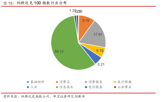 根据纳斯达克指数官网数据,在行业分布方面,信息技术行业占比为57.87%,是指数的主要组成部分,此外,在消费服务、消费品、医疗保健等行业均有分布。