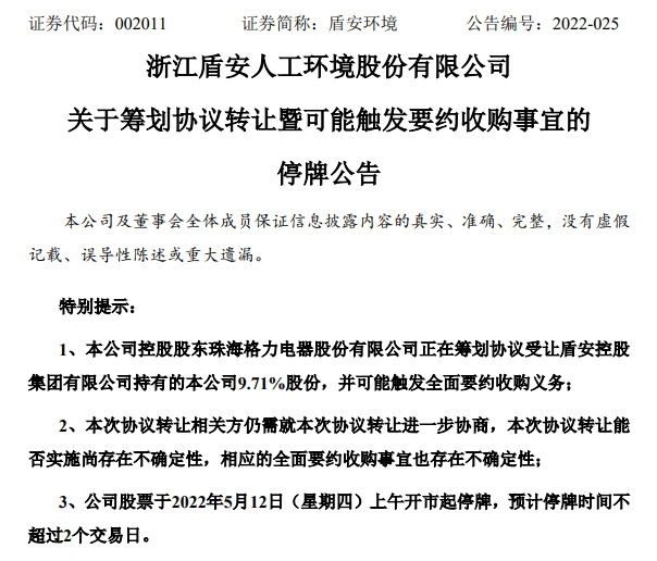 5月11日晚间,盾安环境发布公告称,公司控股股东珠海格力电器股份有限公司正在筹划协议受让盾安控股集团有限公司持有的公司9.71%股份,并可能触发全面要约收购义务。公司股票于5月12日上午开市起停牌,预计停牌时间不超过2个交易日。