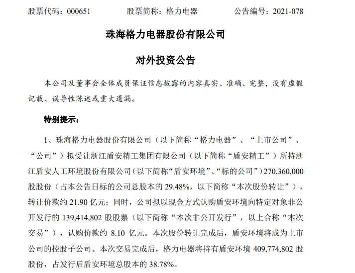 盾安环境是全球制冷元器件行业龙头企业,也是格力电器重要的供应商之一。2021年11月16日,格力电器公告,拟通过股份受让和参与定向增发的方式,拿下深陷债务困境的盾安环境的控制权,合计将耗资29.99亿元。