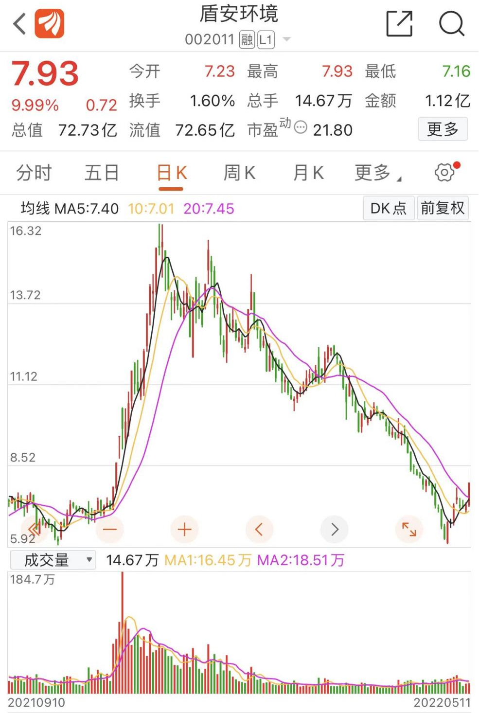 值得注意的是,5月11日,盾安环境开盘后股价一路上涨,在上午10时左右冲至涨停,全天封住涨停板,报收7.93元/股,总市值达72.73亿元。