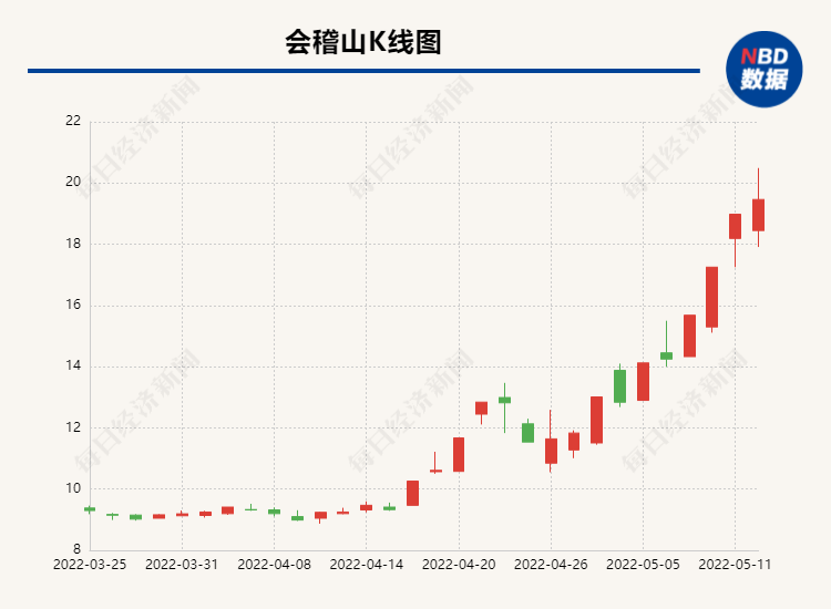 在近7个交易日收获5个涨停板后,5月12日,会稽山(601579.SH)盘中再冲8%,最高触及20.49元/股,市值一度超过100亿元。截至当日收盘,收报19.46元/股,涨幅2.53%,换手率为12.10%。