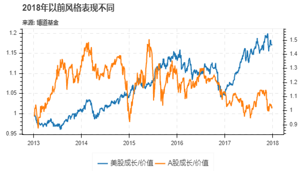 我们内部研究团队在观察中美两国股市风格表现的时候发现,中美两边股市在2018年开始往后,风格表现开始趋于一致,如下图所示。