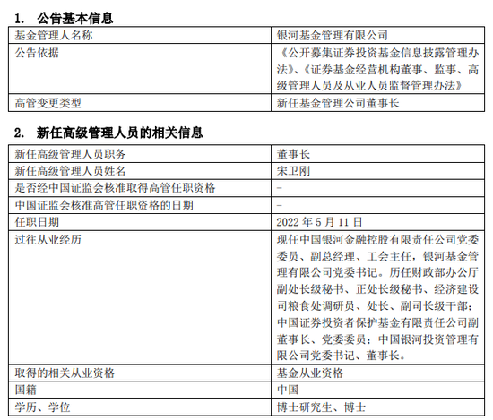 5月12日,银河基金发布公告称,宋卫刚新任公司董事长,任职日期为2022年5月11日。