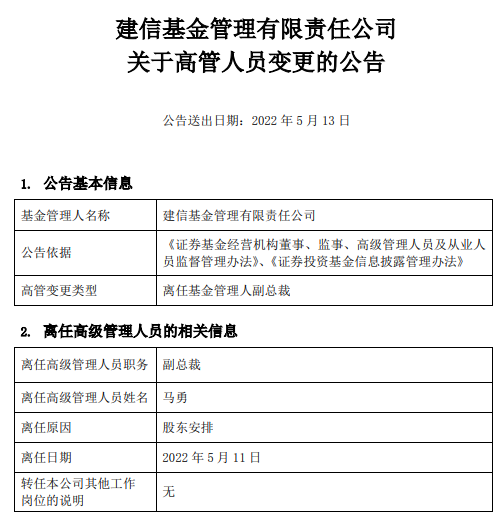 除了原董事长孙志晨,建信基金原副总裁马勇也同样因为股东安排于同一天离任副总裁职位,不转任本公司其他工作岗位。