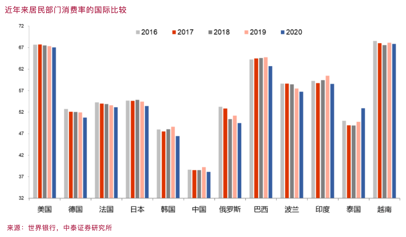 从国际比较看,我国居民部门的消费率(居民部门消费总额占居民可支配收入比重)过低。如2020年美国为67%,日本为53.4%,越南为67.8%,印度为58.6%,而我国只有38.1%。