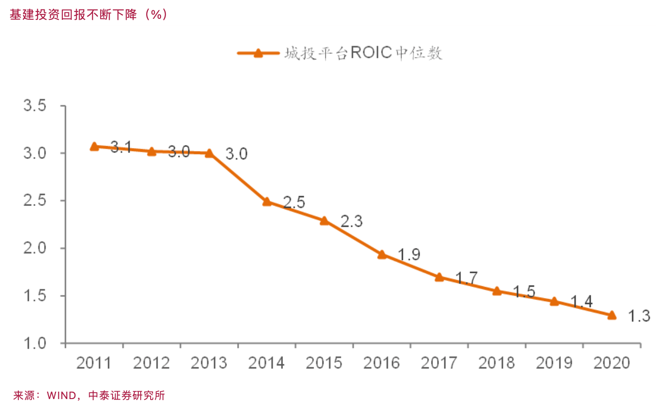 但是,基建投资回报不断下降,目前已经低于专项债融资成本。例如2020年以来,专项债资金用于土储、棚改等项目用途受到较大限制,主要通过城投平台用于基建项目。城投平台投入资本回报率(ROIC)中位数已经从2011年的3.1%降至2020年的1.3%,明显低于专项债平均发行利率,从侧面解释了专项债资金使用效率的下降。