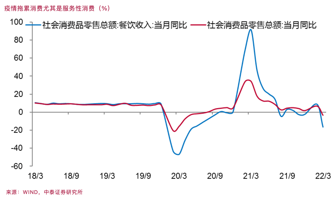 一季度社消零售、限额以上零售增速分别录得3.3%、5.4%,其中3月增速分别为-3.5%、-1.4%,较1~2月增速均由正转负,社零环比增速也同步转负。受全国各地针对疫情采取管控措施的影响下,3月餐饮收入同比增速由正转负至-16.4%,对社零形成较大拖累。分品类来看,3月必需和可选消费品增速双双回落,可选消费回落幅度更大。由于4月份全国疫情加剧,估计消费数据更不乐观。为此,扩消费,避免消费持续负增长成为当然之选。