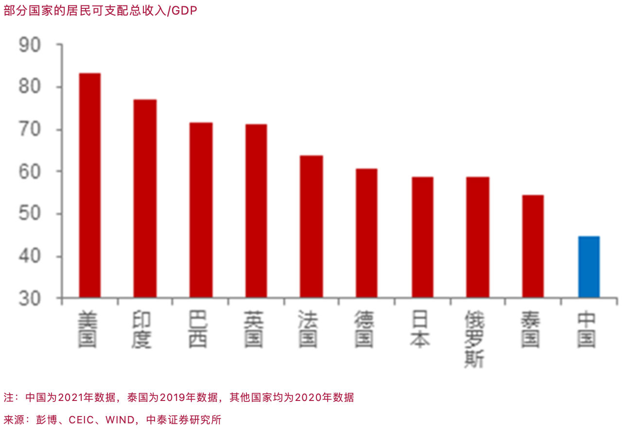 根据《2021年国民经济和社会发展统计公报》,全年全国居民人均可支配收入35128元,比上年增长9.1%,扣除价格因素,实际增长8.1%。人均可支配收入的实际增速与GDP同步,但居民可支配收入总额占GDP的比重只有43.4%,远低于60%左右的全球平均水平,其中美国为83.4%,印度为76.9%,德国为60.7%。
