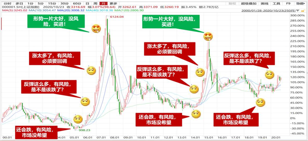 所以,如果仅仅从有风险的角度来考虑投资,那么投资者很容易最后买在牛市最高点。因为只有在市场最疯狂的时候,大家才会觉得“没风险”。而其他情况下,市场总是伴随着风险在犹豫中上涨。就像下图所展示的那样,投资者情绪永远是跟市场的真实风险是反着来的,07年牛市如此、15年牛市如此,未来的牛市行情演绎大概率也是如此。