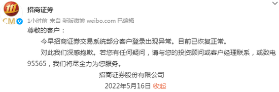 对此,招商证券表示,相关系统已于9点40分左右恢复。随后,招商证券发文致歉称,今早招商证券交易系统部分客户登陆出现异常,目前已恢复正常。对此招商证券深感抱歉。若投资者有任何疑问,请与投资顾问或客户经理联系,或致电95565。