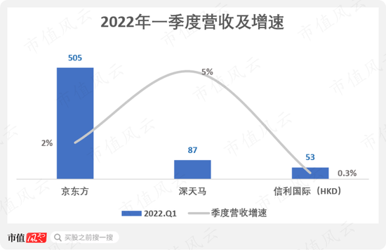 不过毛利率虽然降幅较小,但在营收的对比上信利国际也还是要逊色不少。增速上,京东方及深天马A(000050.SZ)一季度营收增速分别为2%和5%,规模上更要是高出信利国际不少。
