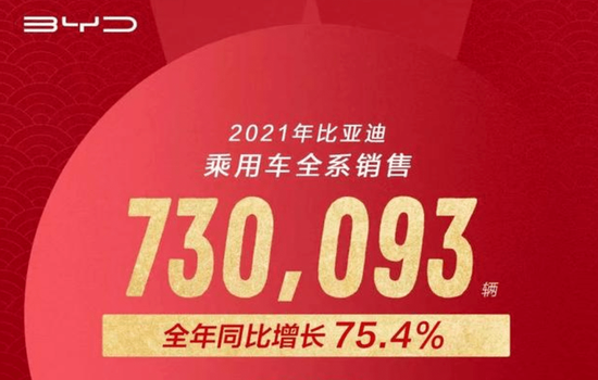 2021年,比亚迪旗下乘用车共卖出了730,093辆新车,同比增长75.4%;新能源车型销量为593,745辆,占总销量的81%,其中EV车型销量320,810辆,DM车型为272,935辆。