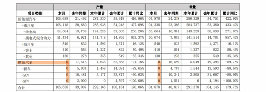 4月3日,比亚迪汽车正式宣布,根据其战略发展需要,自2022年3月起停止燃油汽车的整车生产。据比亚迪销量快报,其3月份共销售10.49万辆汽车,均为新能源汽车,没有生产和销售燃油汽车。