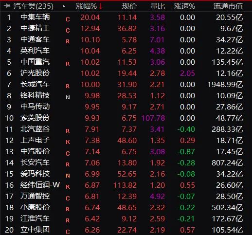 汽车股掀起涨停潮,中集车辆20%涨停,中通客车、英利汽车、中国重汽、长城汽车等也涨停。