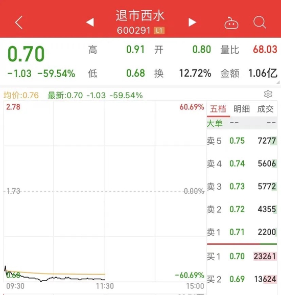 退市西水同样惨烈,开盘也是暴跌腰斩,上午收盘暴跌59.54%,收报0.7元,市值为7.65亿元。