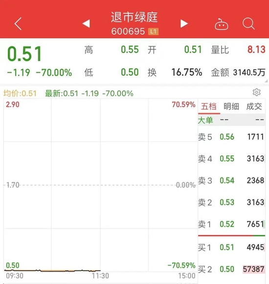 两只退市股,上午一直在低位盘整,上午收盘,退市绿庭仍是暴跌70%,报收0.51元,成交额3141万元,市值仅剩3.63亿元。