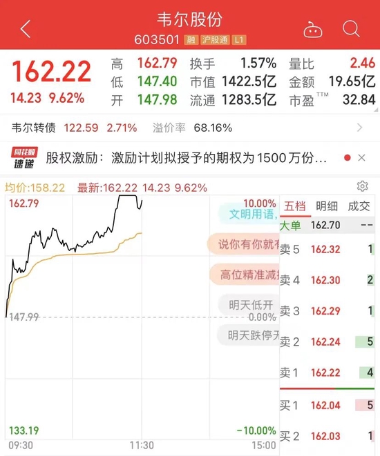 1000多亿市值的芯片股韦尔股份盘中冲涨停。