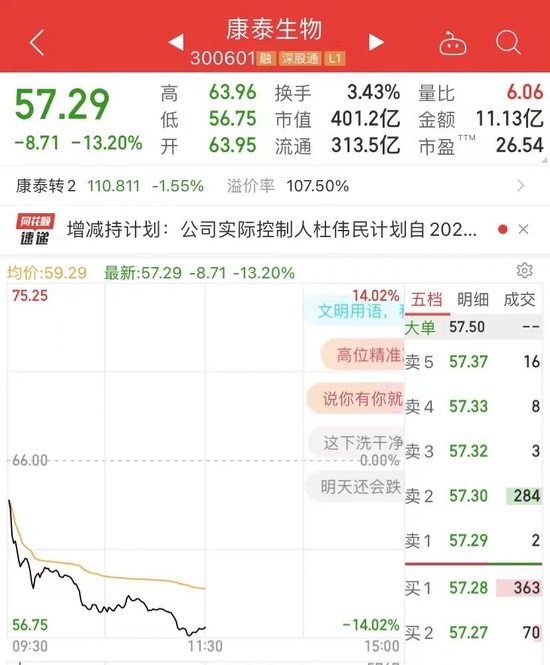 400亿市值疫苗大白马股康泰生物,上午股价突然暴跌13%。