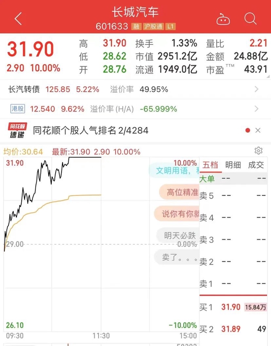 市值近3000亿元的大白马股长城汽车突发涨停。