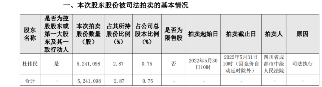 5月16日晚,康泰生物发布股东部分股份将被司法拍卖暨被动减持的预披露公告,控股股东、实际控制人杜伟民持有的部分公司股份524.11万股将于2022年5月30日10时至2022年5月31日10时止在淘宝网司法拍卖网络平台进行公开网络司法拍卖活动。公告显示:司法执行机构为四川省成都中级人民法院。