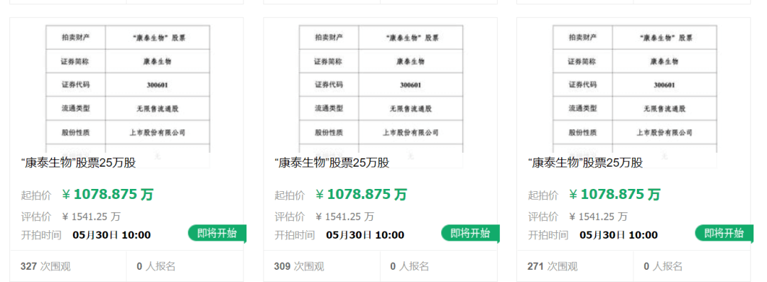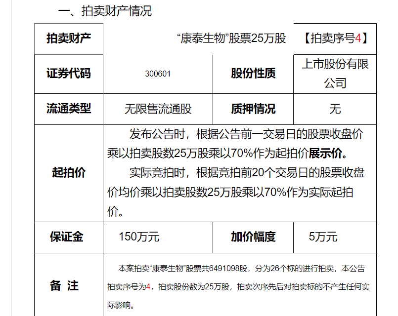 淘宝拍卖上,对于康泰生物的拍卖方式有了进一步约定:拍卖起拍价为发布公告时,根据公告前一交易日的股票收盘价乘以拍卖股数25万股乘以70%作为起拍价展示价。