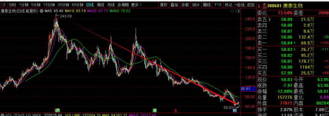 康泰生物今天大跌,或与控股股东杜伟民的500多万股遭司法拍卖有关,虽然股份数不多,但是对市场的冲击巨大。半个交易日即缩水60亿,按当前6万股东数计算,相当于人均亏损10万。