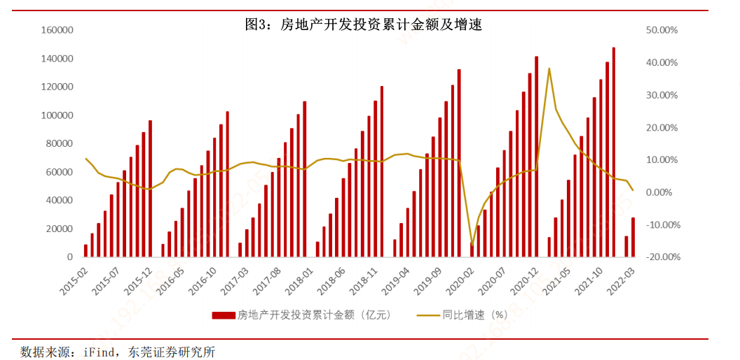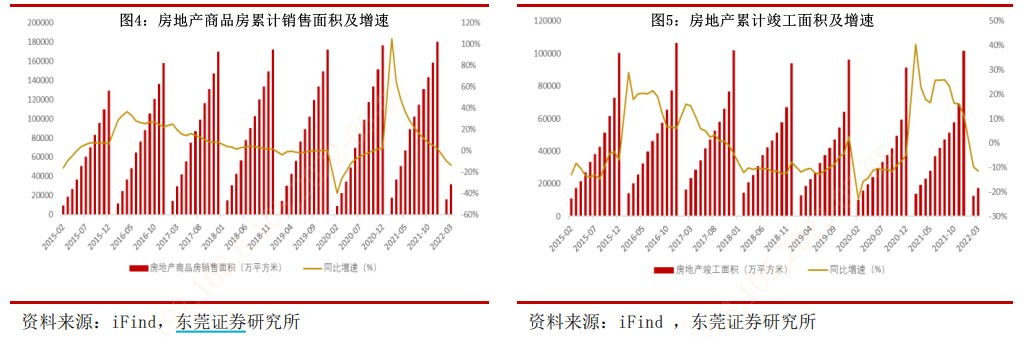 2022 年 3 月,房地产开发投资 1.32 万亿元,同比下降 2.39%;1-3 月累计金额 2.77 万亿元,同比增长 0.69%,房地产开发累计投资金额已连续 13 个月同比下降。3月单月房地产累计销售面积、竣工面积分别同比下降 13.78%、11.47%, 分别降幅环比扩大 4.21pct、1.67pct。当前房地产开发投资、销售面积等数据仍在探底中,但伴随着政策的边际宽松,行业数据将边际改善,房地产市场有望回暖。(数据来源:Wind,东莞证券研究所)