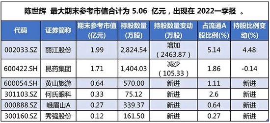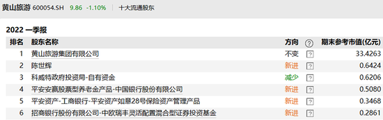 例如,今年一季度,陈世辉进入黄山旅游前十大股东榜,期末,其持有570万股,市值约6400万元。