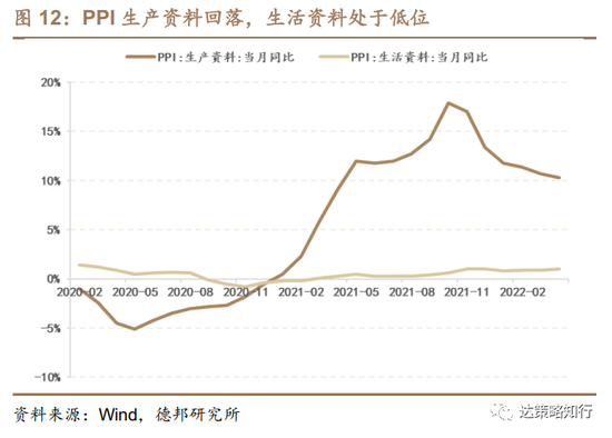 PPI:生产资料环比下降,生活资料环比持平。4月生产资料同比10.3%,下降0.4个百分点,环比0.8%,生活资料同比1%,上涨0.1个百分点,环比与上月持平。由于各地区各部门对保供稳价决策部署的坚决贯彻,生产资料环比涨幅下降,其中石油和天然气开采业PPI环比增长1.2%,有色金属矿采选业PPI环比增长2.7%,黑色金属矿采选业PPI环比增长4%,煤炭开采和洗选业PPI环比增长2.5%。