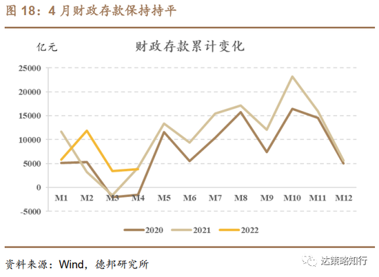 目前降息幅度、流通性投放以及政府工作报告披露的专项债规模、赤字率,都不如2020年疫情以后。但本轮疫情发生于两会以后,另外4月29日中央政治局会议提出,全年经济社会发展预期目标要努力实现,要抓紧谋划增量政策工具。4月财政存款仅增410亿元,疫情冲击下财政收入更显乏力。另外3月公共财政支出累计同比增4884亿元,全年目标为多增20000亿,财政支出仍要维持强度。