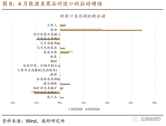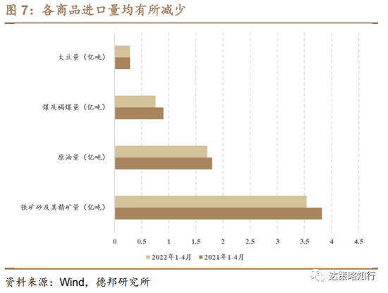 原油、煤炭等价格的提升,对进口形成支撑,但商品进口量均出现萎缩。从进口产品来看,原油是主要拉动项,4月份贡献了6.91%(前值3.49%),另外煤炭也贡献了0.84%(前值0.06%),但铁矿砂及其精矿贡献了-2.08%(前值-2.43%)。但正贡献主要是由于价格贡献,原油、煤炭、大豆等进口量减价扬。原油进口1.71亿吨,同比减少4.8%,进口均价每吨635.2美元,同比上涨52%;煤炭进口0.75亿吨,同比减少16.4%;铁矿石进口则是量价齐跌,前四月进口铁矿砂3.54亿吨,同比减少7.1%,前三月进口均价每吨111.6美元,同比下跌27%。