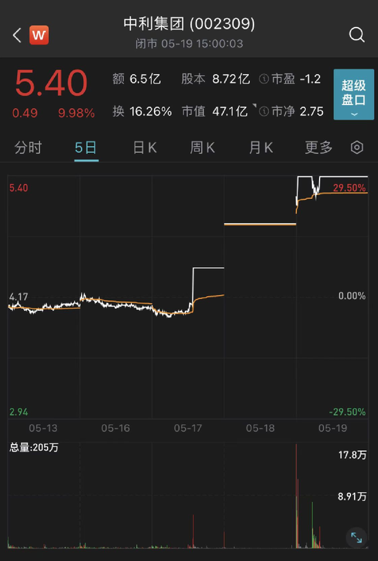 截至5月19日收盘,中利集团每股报5.4元,涨幅9.98%,换手率16.26%,成交量123.97万手,成交额6.49亿元,总市值涨至47.1亿元。