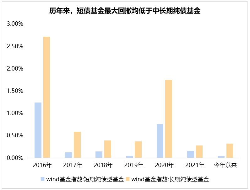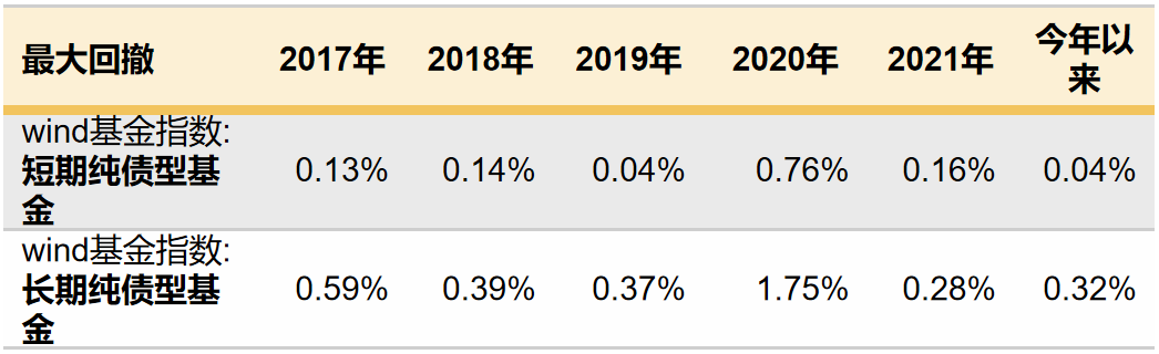 (2)预期风险“中长期纯债基金-”:相比于中长期纯债基金,短债基金主要聚焦于短久期品种的资产,通过控制投资组合的久期,能够有效应对市场波动、实现对投资组合回撤的良好控制。2016年以来,短债基金的年度最大回撤均显著低于中长期纯债基金。