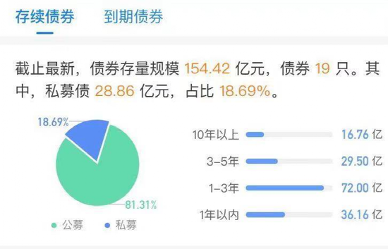 金科股份更多的兑付压力来源于境内发行的债券,截至最新,金科股份存续19只境内债券,对应存量规模为154.42亿元;具体到一年以内到期的部分为36.16亿元。