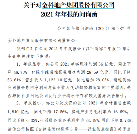根据问询函,深交所关注到,金科地产2021年实现净利润36亿元,同比下降48.78%,扣除非经常性损益后净利润28.69亿元,同比下降53.61%,营业收入1123.1亿元,同比增加28.05%。