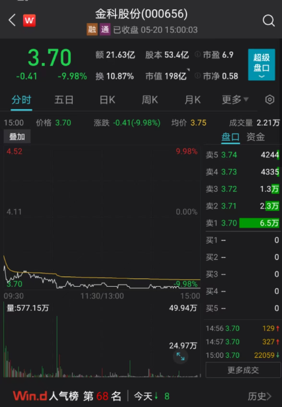 截至收盘,金科股份股价跌9.98报3.7元/股,全天成交额21.63亿元,换手率10.87%,最新总市值198亿元。