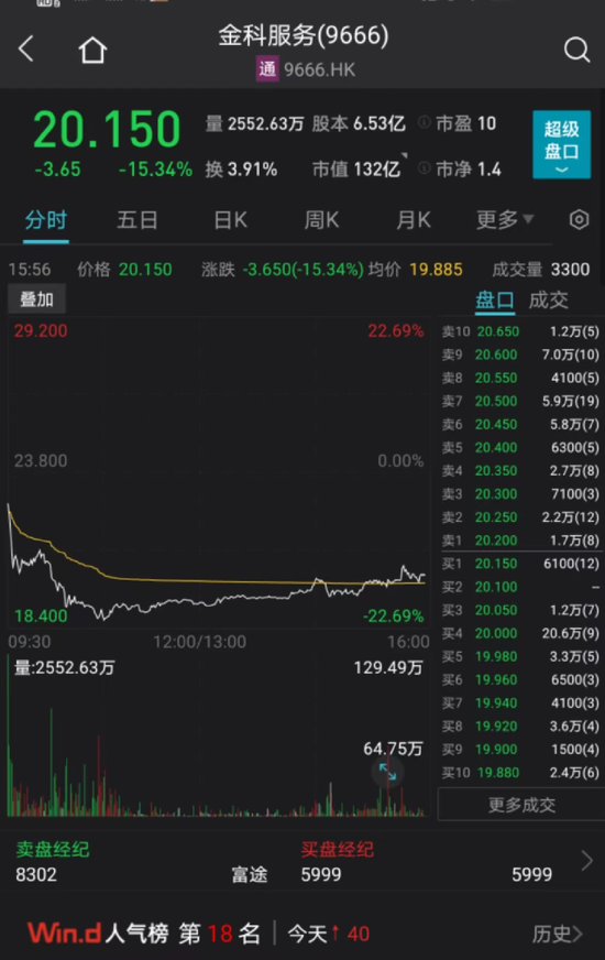 同日,金科股份旗下物业上市平台金科服务早间开盘报22.35港元,跌6.09%;截至早间收盘报19.16港元,跌19.5%。截至下午收盘,下跌15.34%。
