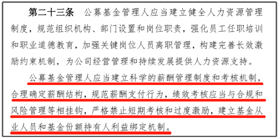 四是全面构建长效激励约束机制,要求董事会对经营层实行三年以上长周期考核,基金管理公司应将长期投资业绩、合规风控情况等作为关键岗位人员考核的重要依据,实施薪酬递延、追索扣回与奖金跟投制度,严禁短期考核与过度激励。